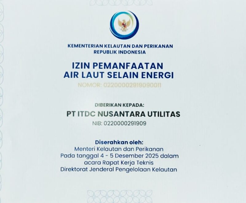Ketikjari.com – PT ITDC Nusantara Utilitas (ITDC NU), anak usaha InJourney Tourism Development Corporation (ITDC), mencatatkan tonggak sejarah baru sebagai perusahaan pertama di Indonesia yang secara resmi mengantongi izin pengolahan air laut menjadi air bersih layak konsumsi dari Kementerian Kelautan dan Perikanan (KKP).