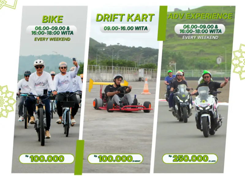 Selain itu, pengunjung juga dapat mencoba berbagai pengalaman berkendara di lintasan sirkuit, seperti Taxi Ride dengan promo Rp400.000 untuk 2 lap dari harga normal Rp650.000 untuk 3 lap, serta CBR 250 Experience dengan harga promo Rp400.000 untuk 3 lap dari harga normal Rp450.000.