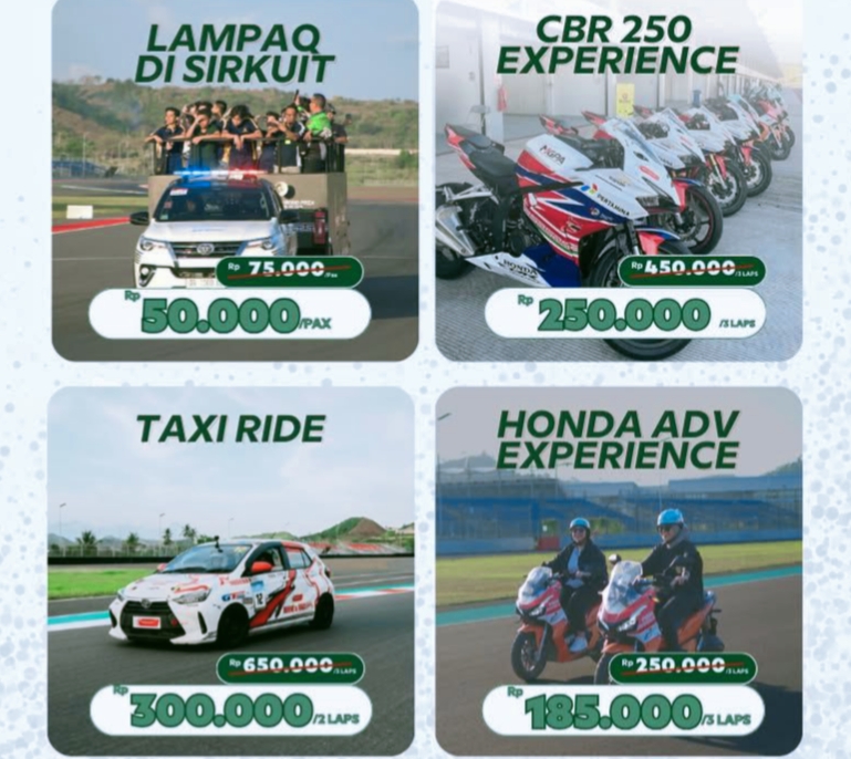 Program yang berlangsung mulai 20 Desember 2025 hingga 4 Januari 2026, setiap hari pukul 06.00–18.00 WITA, menghadirkan beragam pengalaman lintasan bagi wisatawan, mulai dari Lampaq di Sirkuit, CBR 250 Experience, Taxi Ride, hingga Honda ADV Experience.