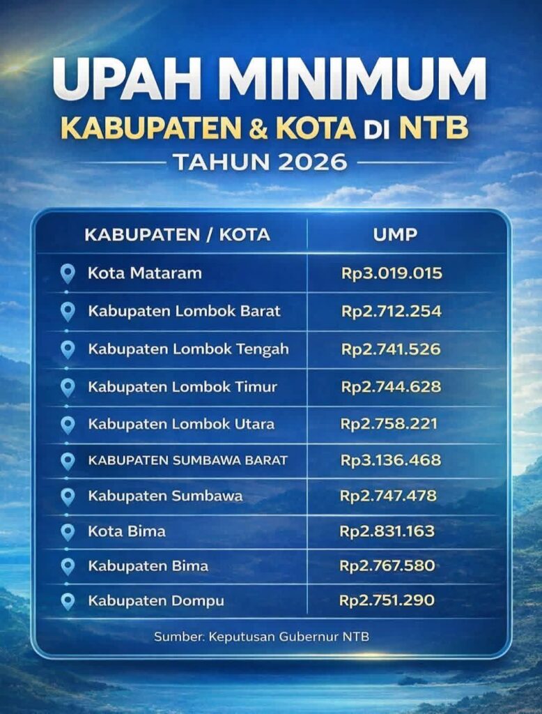 Sumber: Keputusan Gubernur Nusa Tenggara Barat tentang Penetapan Upah Minimum Kabupaten/Kota (UMK) NTB Tahun 2026.